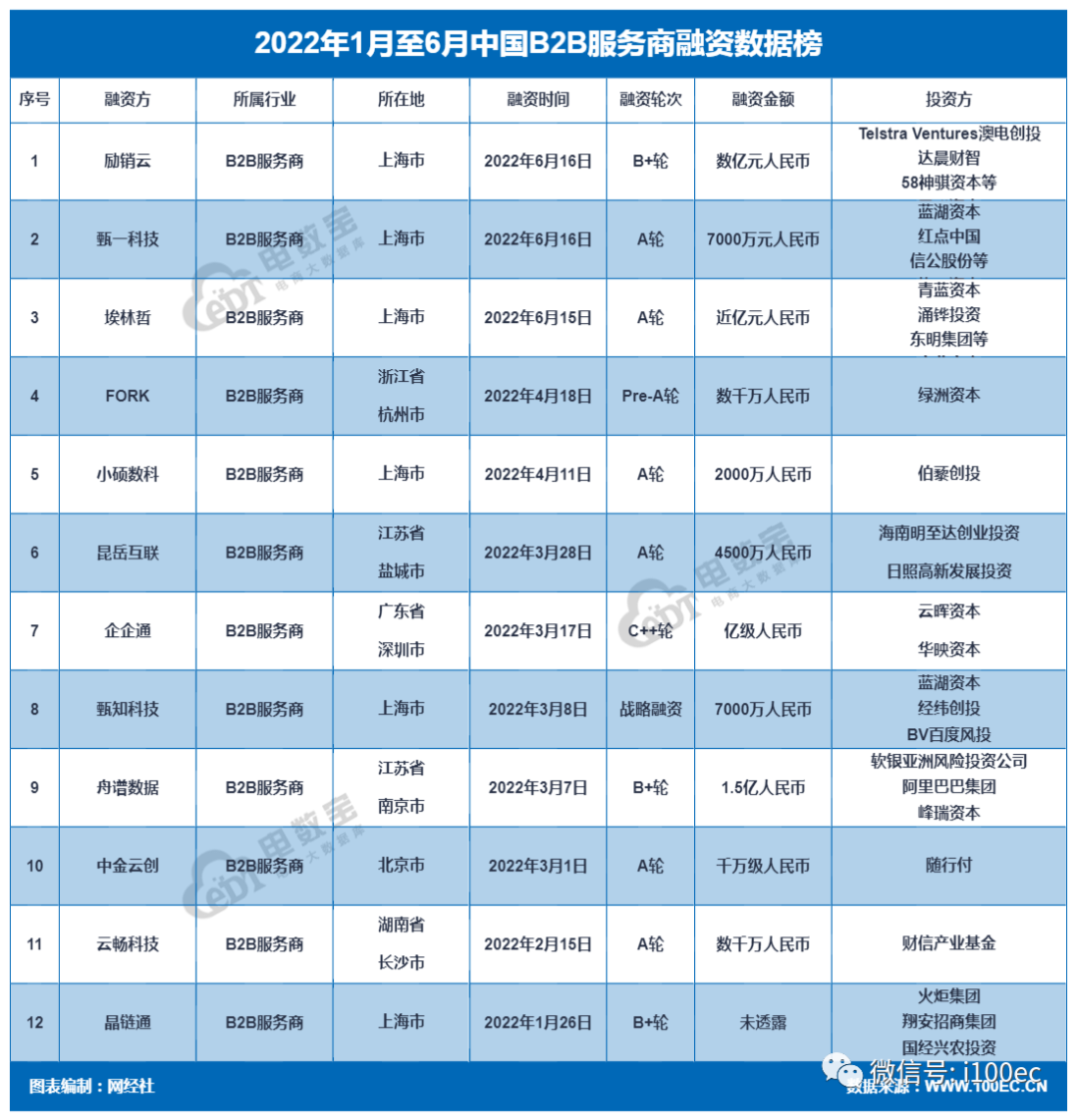 据“电数宝”电商大数据库(DATA.100EC.CN)显示,2022年1月至2022年6月,国内B2B服务商领域共发生了12起投融资事件,融资总额超8亿元。涉及的公司包括:励销云、甄一科技、埃林哲、FORK、小硕数科、昆岳互联、企企通、甄知科技、舟谱数据、中金云创、云畅科技、晶链通等。