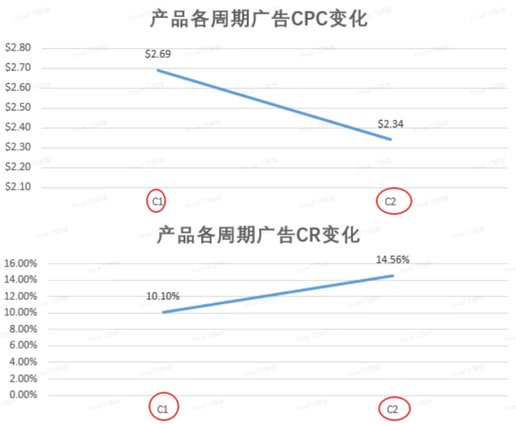 ● 广告表现:CPC 从 $2.69 → 降至 $2.34,CR(转化率)从 10.10% → 提升至 14.56%。