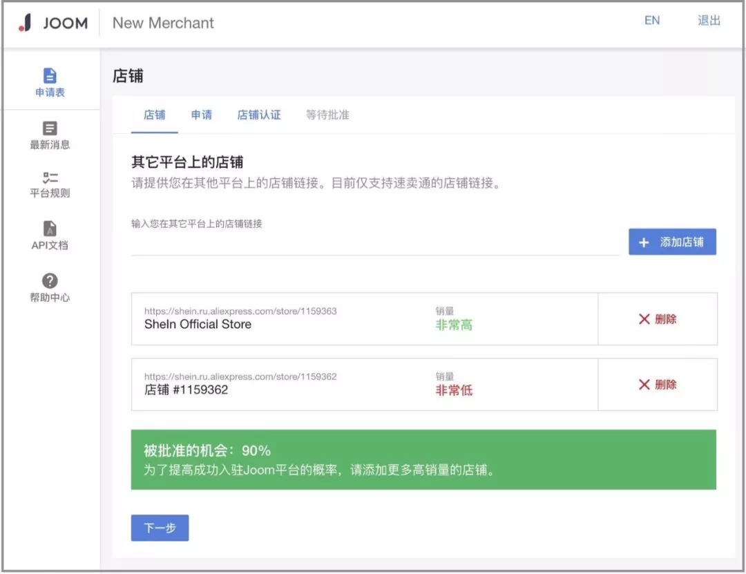 - 卖家需要验证自己的速卖通店铺,Joom会分析卖家速卖通店铺的表现来决定是否通过入驻申请,整个申请流程最快两周。