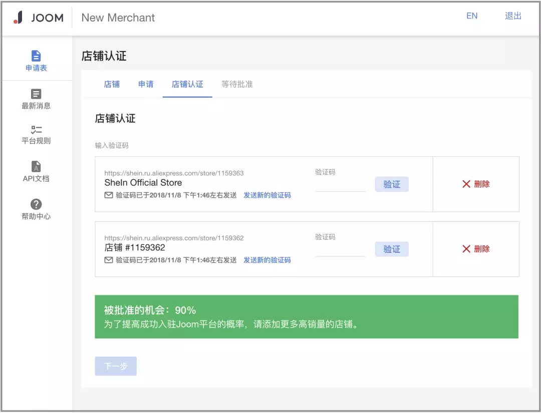 填写申请表并上传公司文件,审核完成后,需用验证码验证店铺,然后进入最终审核环节。