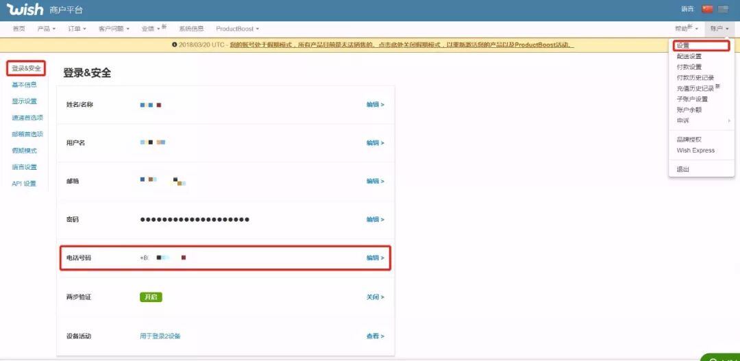 “两步验证”功能为平台账户增添了额外的一层保护,当账户在非常用的设备端登录,修改密码、收款账户等账户基本设置时,“两步验证”都会发送一段短信安全码至您预留的手机号码上,准确输入后,方可继续操作,大大提升了账户的安全性。这也是Wish平台为了切实保护商户资金安全,提供的更为有效的管理措施。