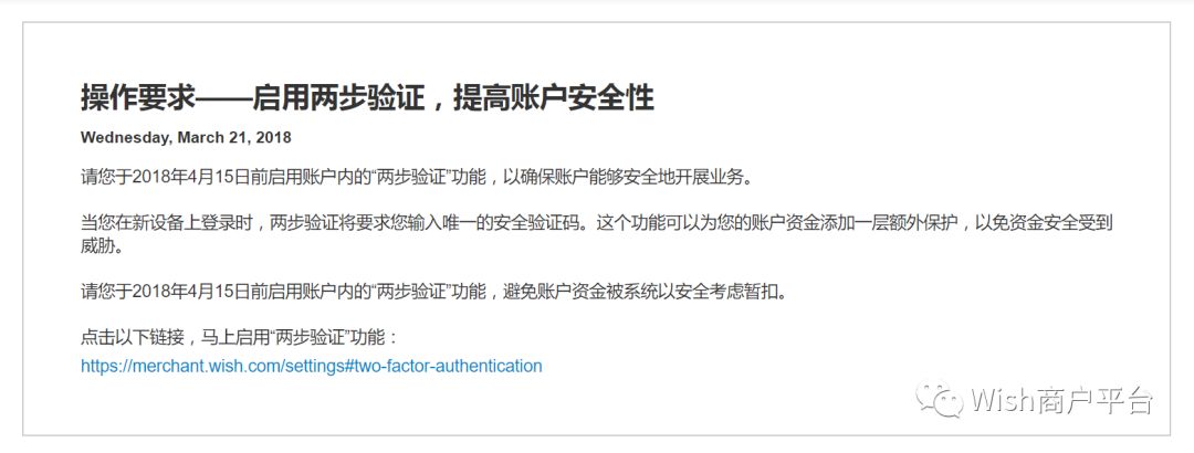 4月15日是什么日子?放款日!兴不兴奋?激不激动?然而,如果你还没做这一步,账户资金会因为安全考虑被暂扣哦~早在3月21日,Wish平台就发布了关于开启“两步验证”的政策要求↓↓↓