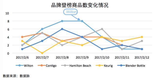 在上周 Kitchen & Dining 品类的 Movers & Shakers 榜单中,美国烘焙品牌 Wilton 表现出色,凭借在2017年2月7日至9日每日上榜商品数6款以上的不俗战绩,以总登榜次数30次、登榜商品数17款的发挥击败了 Contigo、Hamliton Beach 等竞争对手,夺得品牌综合排名首位。