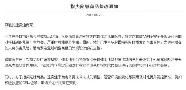 速卖通平台将依据《全球速卖通禁限售违禁信息列表》第十七条高风险及安全隐患类商品管控规则,于2017年7月17日起对存在安全隐患的指尖陀螺商品进行退回,并扣除1分/次的处理。