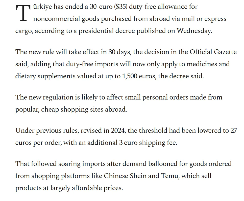 这一新政不仅影响土耳其,更标志着全球范围内对跨境电商政策的系统性收紧。