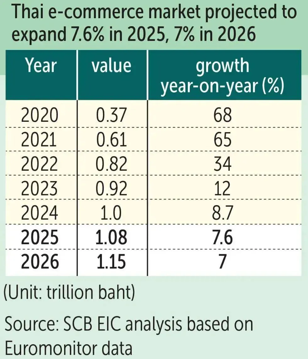 泰国电商市场2026年进入平稳增长阶段,市场规模达1.15万亿泰铢(约362.25亿美元),增速放缓至7%。