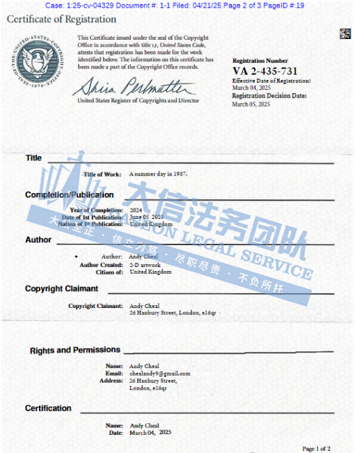此案为版权维权,涉及1张版权图,作品名为:《1987 年的一个夏日》,版权号为:VA0002435731,该作品于2023年6月创作,于2025年3月下证,以下是涉案版权信息,未经授权不得擅自使用,侵权风险极高!跨境卖架尽快检索下架!