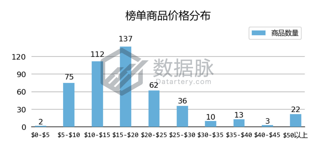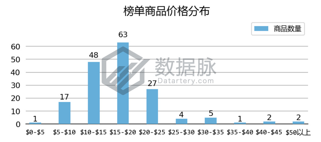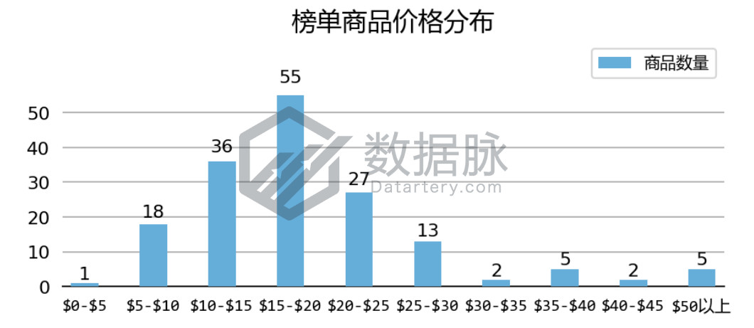 上周 Clothing, Shoes & Jewelry 品类 Hot New Releases 榜单商品最高价$89.99, 最低价$3.29,平均价格$18.04。骆探长(shujumai.com)发现,在上榜的商品中, 其中,定价于$10.00-$20.00价格段的商品数量较多,其中有37.06%商品价格位于$15.00-$20.00价格段,另有28.24%的商品价格位 于$10.00-$15.00价格段。此外骆探长(shujumai.com)发现,上周仅有2款上榜商品的价格超过了$50.00,相比于前几期分析, 该周上榜商品整体平均价格与Best Sellers榜单中的表现类似,同样出现了些许回暖,高价商品在榜单中的竞争力有所增强。