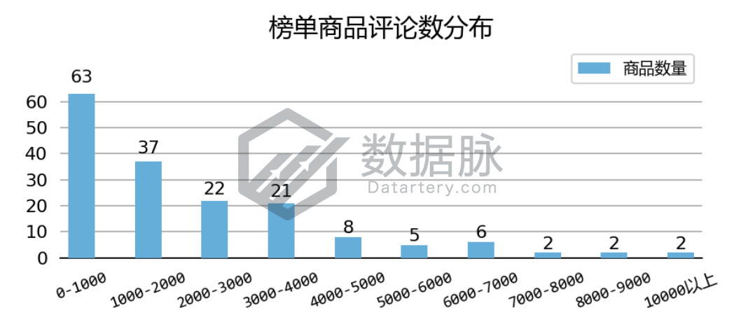 在上周登榜 Clothing, Shoes & Jewelry 品类 Best Seller 榜单的商品中, 单个商品拥有的最大评论数为11328.00条,最小评论数为2.00条,平均评论数2270.16条,评论平均星级4.28星。 该周评论数在1000条以下的上榜商品较多,占上榜商品总数的37.50%,另有22.02%的上榜商品评论数在1000条至2000条之间。此外骆探长 (shujumai.com)发现,上周还有两款评论数破万的商品进榜,占上榜商品总数的1.19%。