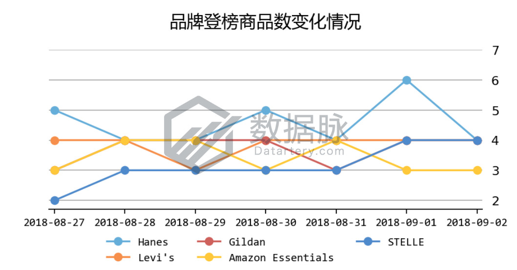 可以看到,在上周Clothing, Shoes & Jewelry品类的Best Seller榜单中, 品牌Hanes凭借9月1日单天进榜6款商品的出色发挥再次拔得头筹,在一周中获得32次等榜次数,位居品牌综合排名首位。于此同时骆探长(shujumai.com)注 意到,儿童芭蕾舞运动用品品牌STELLE在上周的7天中单日进榜商品数稳步上升,并在7天中夺得22次等榜机会,品牌商品的后续市场潜力同样值得关注。