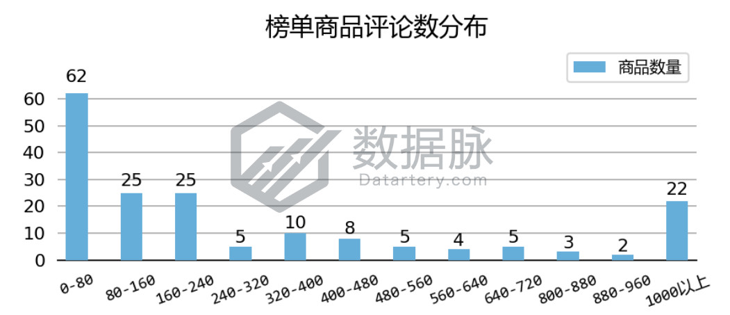 在上周登榜 Clothing, Shoes & Jewelry 品类 Hot New Releases 榜单的商品中, 单个商品拥有的最大评论数为5933.00条,最小评论数为0.00条,平均评论数432.86条,评论平均星级4.22星。 骆探长(shujumai.com)发现,其中35.23%的上榜商品评论数不超过80条,另各自有14.20%的上榜商品评论数在80-160条之间与160-240条之间,于此同时,上周共有22款上榜商品的评论数超过了1000条,占上榜商品总数的12.50%。此外,与前几期分析相比,该周进入Hot New Releases榜单的商品整体平均评论数出现回落,全新商品再次迎来冲榜良机。