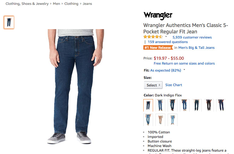 可以看到,在上周Clothing, Shoes & Jewelry品类的Hot New Releases榜单中, 榜单综合表现靠前的五款商品中有两款为来自品牌Wrangler的男士牛仔长裤,其中经典的五袋款式牛仔裤在9月1日之后连续两天蝉联Hot New Releases榜首,而同品牌旗下的一款休闲式牛仔裤也在一周中6次跻身榜单前五,取得了平均排名4.43的不错成绩。