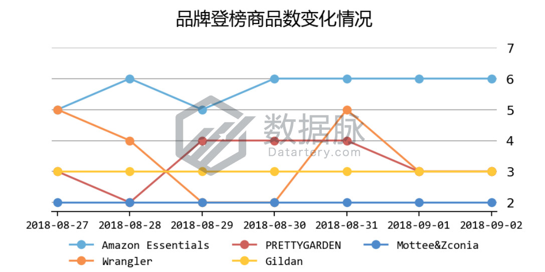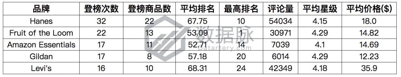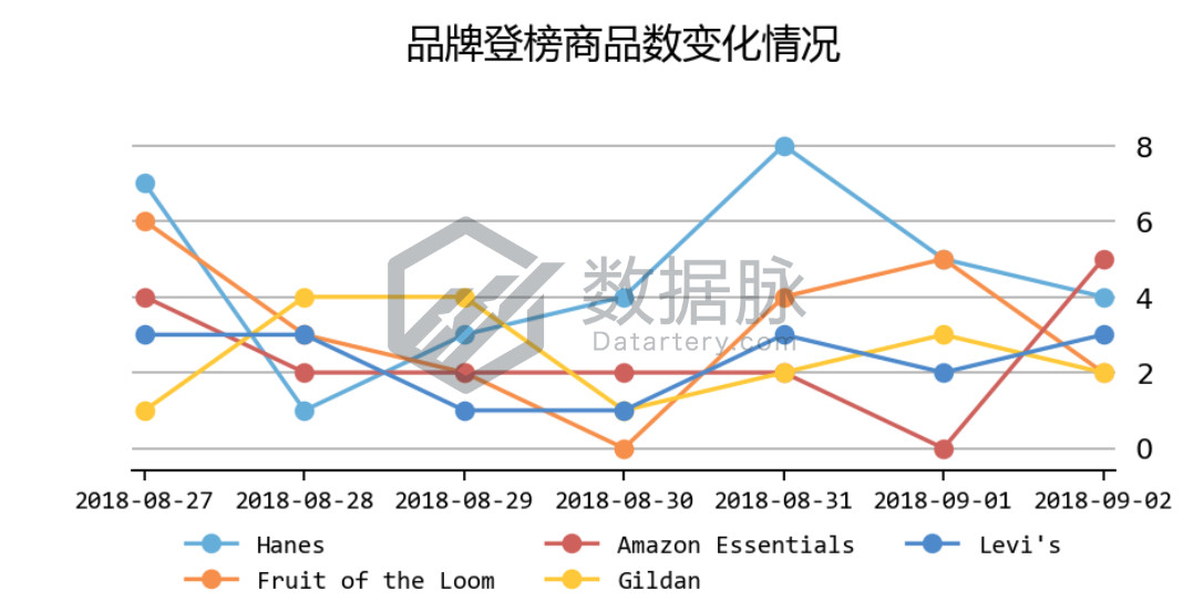 可以看到,在上周 Clothing, Shoes & Jewelry 品类的 Movers & Shakers 榜单中, 大品牌 Hanes 依旧保持稳定发挥,在7天中夺得32次进榜机会,成功卫冕品牌综合排名首位。与此同时,品牌Fruit of the Loom、Amazon Essentials、Gildan、Levi's同样表现稳健,分别位居品牌综合排名的第二、三、四、五位。骆探长(shujumai.com)发现,在近期榜单表现活 跃的品牌中,以运动休闲男装为主营产品的品牌相对较多,相关的产品值得卖家注意。