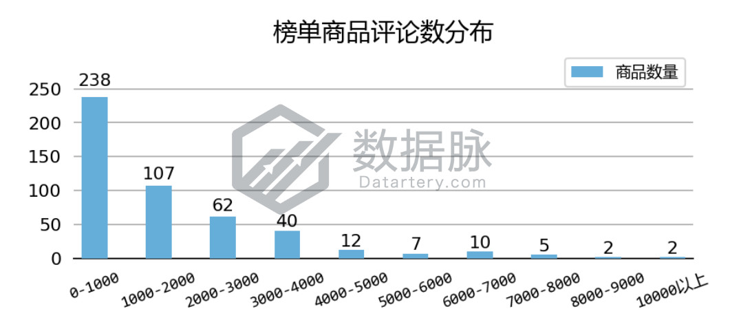 在上周登榜 Clothing, Shoes & Jewelry 品类 Movers & Shakers 榜单的商品中, 单个商品拥有的最大评论数为11328.00条,最小评论数为0.00条,平均评论数1678.98条,评论平均星级4.27星。 骆探长(shujumai.com)注意到,在上榜的商品中,有多达49.07%的商品评论数不超过1000条,另有22.06%的商品评论数在1000条至2000条之间。