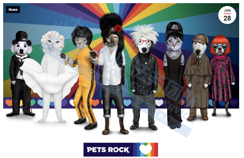 PETS ROCK是英国Polyblank Designs Limited旗下的创意艺术品牌,巧妙融合名人文化与宠物形象。该品牌以幽默潮流风格,将猫狗等宠物重塑为流行歌手、影视人物等明星角色,形成独特插画IP。其授权产品涵盖文创、服饰、家居等多个领域,深受全球年轻消费者喜爱,是具有广泛市场影响力的潮流品牌之一。