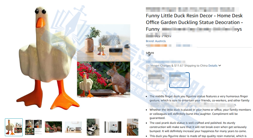 此案为版权维权,涉及8个搞怪摆件版权图,侵权风险极高!未经授权以下图片以及原告其他作品均不得擅自使用,跨境卖家尽快检索下架,避免TRO侵权风险!