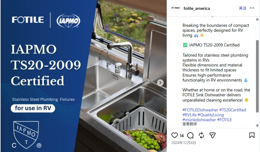 所有产品均通过美国 UL 安全认证,适配 110V 本土电压标准;针对北美小户型厨房与房车场景,推出更紧凑的嵌入式产品,其中房车专用厨电通过美国房车 TS20 认证,成功切入房车细分蓝海市场。