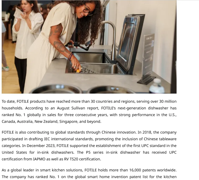 更重要的是,方太还通过中国创新为全球标准做出贡献。2018年,该公司参与起草了IEC国际标准,推动了中国餐具类别的纳入。2023年12月,方太支持制定了美国首个水槽洗碗机UPC标准。P5系列水槽洗碗机已获得IAPMO颁发的UPC认证以及RV TS20认证。