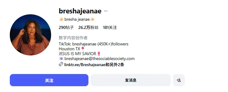 垂类达人一:@breshajeanae(粉丝26.2万)
