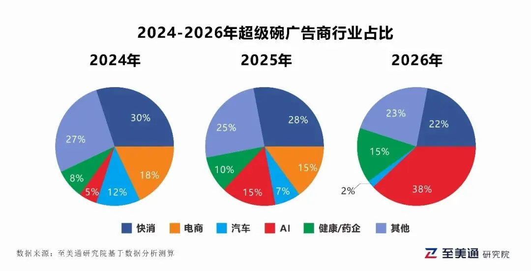 AI的崛起:占比从2024年的5%火箭般蹿升至2026年的38%,成为新霸主。这表明北美AI竞争已从技术研发,转入抢占大众市场认知的终极战场。 传统主力的退潮:曾占据重要席位的电商平台与汽车行业呈现断崖式下跌。它们的缺席,为市场敲响了明确的警钟。