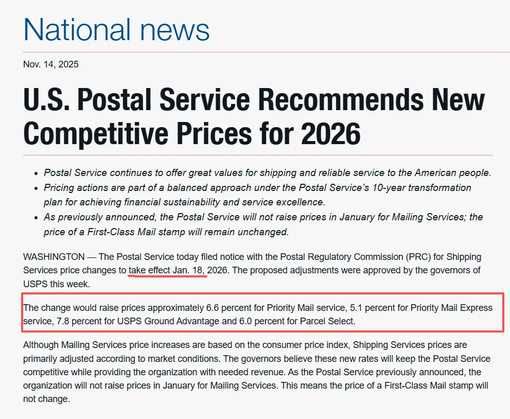 USPS则宣布自2026年1月18日起上调多项包裹服务价格,具体包括:地面运输服务上涨约7.8%,优先邮件服务上涨约6.6%,快递服务上涨约5.1%,包裹选择服务上涨约6.0%,信函及首类邮件(First-Class Mail)邮票价格暂不调整。