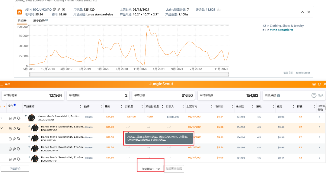 (1) 如上图,父子变体大类别排名一样,那么插件里销量结果显示的是所有变体汇总的总销量。假设大类Rank显示都是#2,父子变体大类排名一样,那么,显示的销量数据则是所有变体的销量总和(绝大多数都是这个情况);