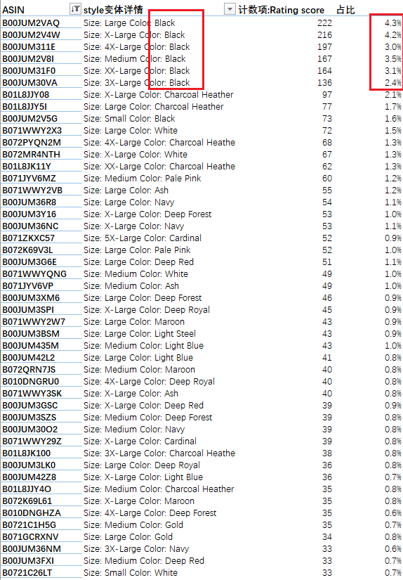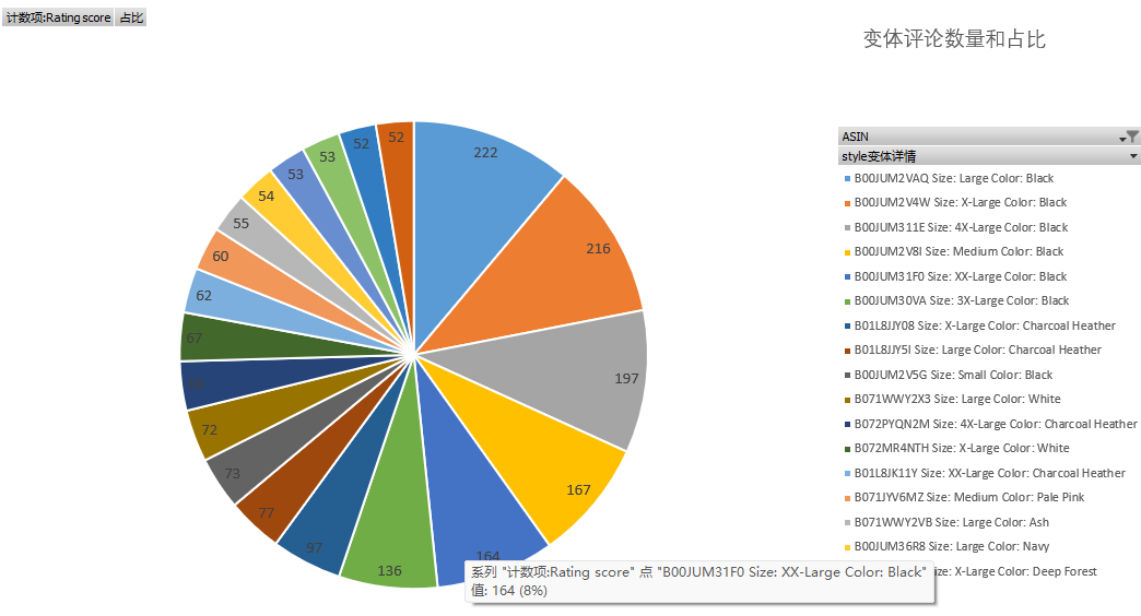 4 .我们可以清晰直观看到这款产品留评数据透视表和可视化分析饼状图。黑色是卖的最好的,尺寸大小Size里 Large和X-Large 这两个占比高。