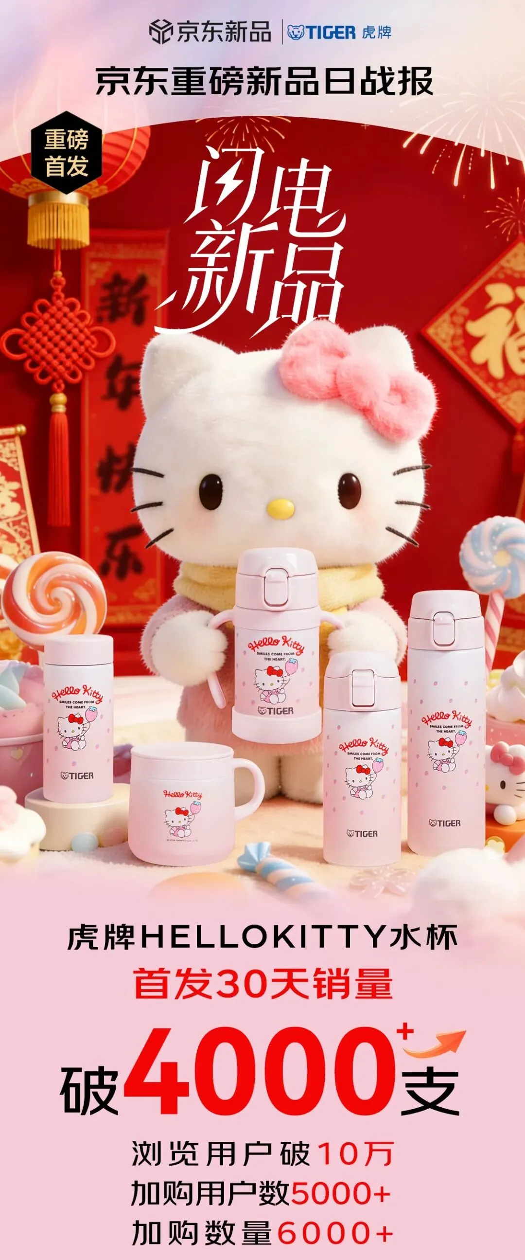 2025年下半年,虎牌与三丽鸥合作,并没有直接拍板IP,而是通过京东更大盘的数据与前置测试,半天到一天拉出核心信息,一周左右完成验证,最终锁定Hello Kitty和帕恰狗,匹配便捷开合的简约便携杯型,迅速跑出爆款。