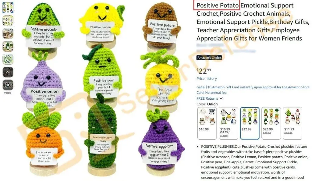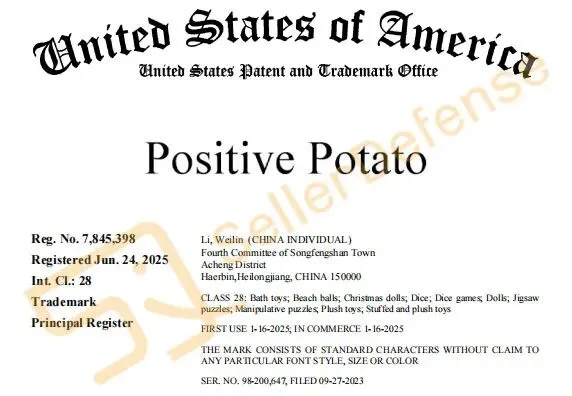 本案为国人原告,售卖以 POSITIVE POTATO 商标命名的毛绒玩具和钩编玩偶产品,其中包括一款通常手持印有 POSITIVE POTATO 字样卡片的毛绒土豆玩偶。类似款式玩偶曾发案专利,本案涉及商标注册在第28类:洗澡玩具;沙滩球;圣诞娃娃;骰子;骰子游戏;玩偶;拼图;毛绒玩具;填充毛绒玩具。
