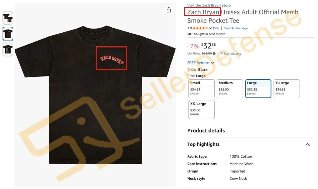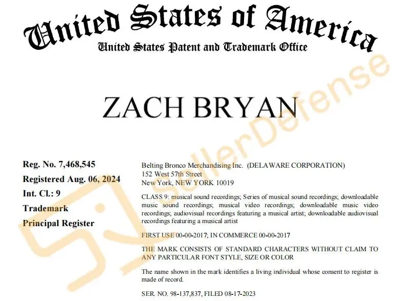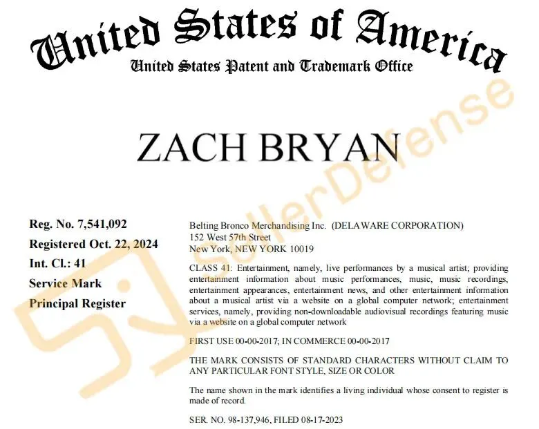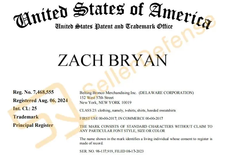 原告 Ceremony of Roses Acquisition LLC 从事各类明星周边商品的生产和销售,包括但不限于巡演手册、T恤、球衣、运动衫、帽子、徽章和海报。ZACH BRYAN 扎克·布莱恩是一名美国乡村乐男歌手、词曲作者。他曾发布过多张广受好评的音乐专辑,具有一定的知名度。以下商标未经允许不得使用!