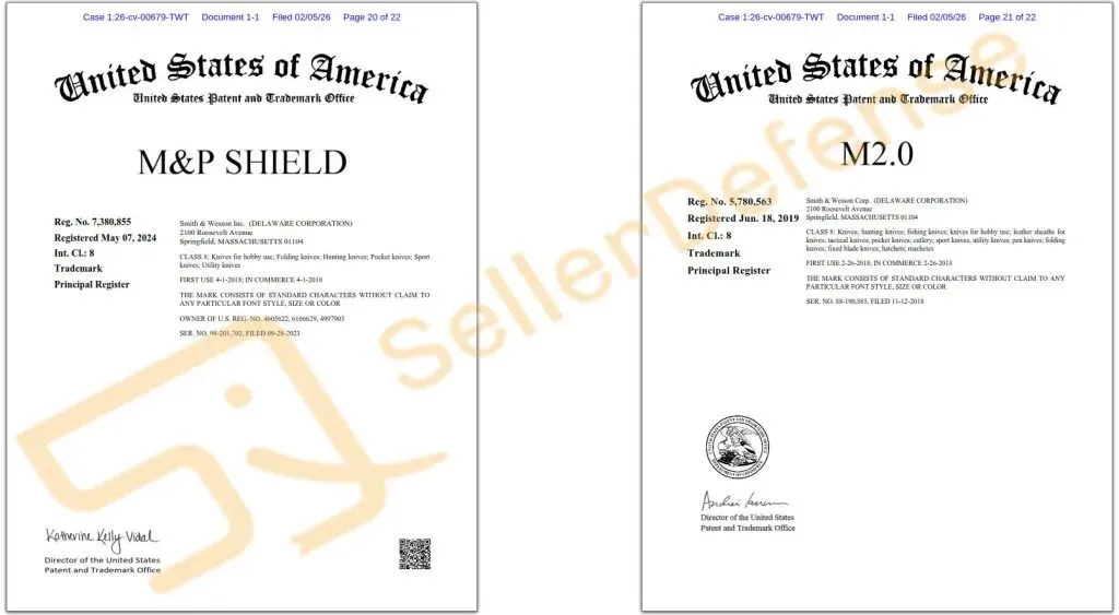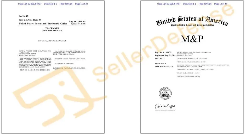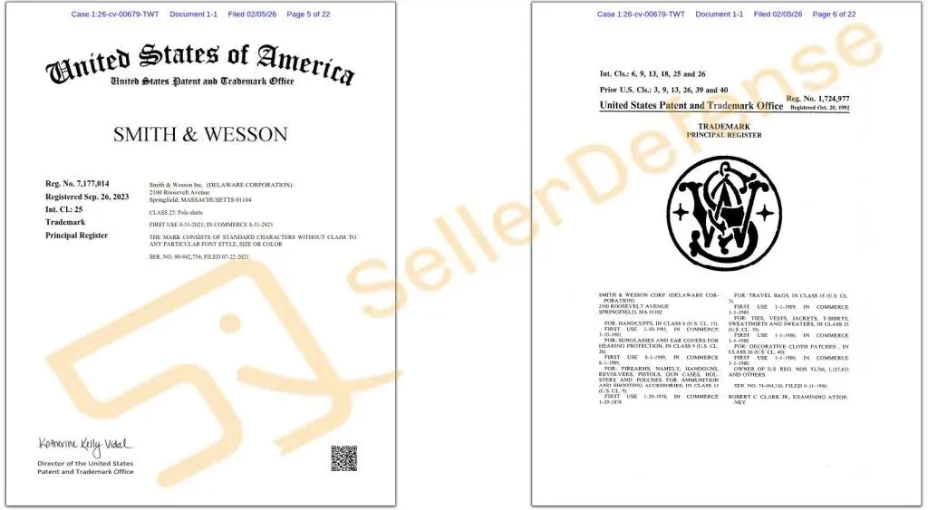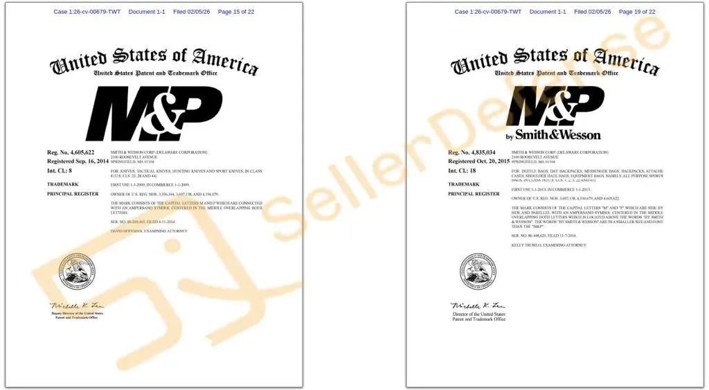 原告 Smith & Wesson Brands, Inc. 于1852年在美国成立,如今是历史最悠久、最知名的枪械制造商之一。原告还提供各种其他消费品,包括T恤、运动衫、帽子、包袋、桌垫、腰带、墙饰、钱包、刀具等等,这些产品均使用或与各种商标相关联。以下商标注册在多个类目,请相关卖家注意排查避雷!