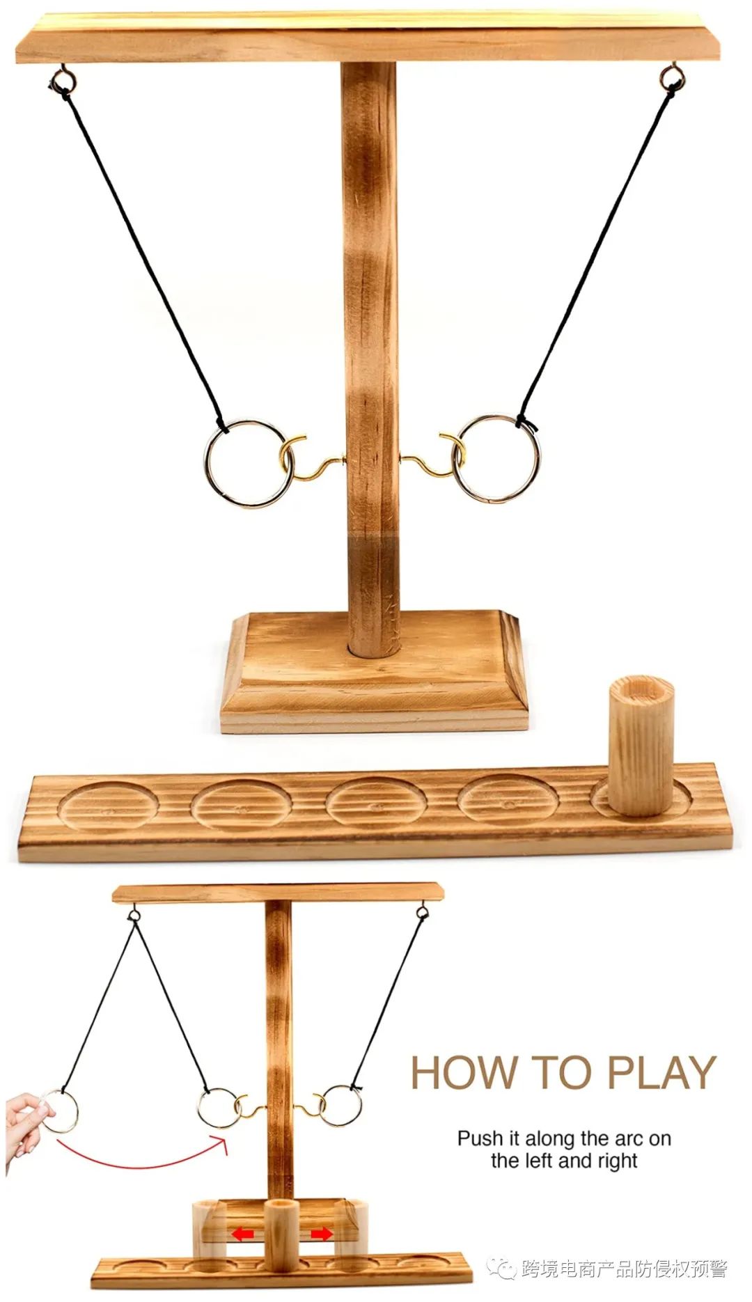 不过,这种款式的【钩环抛游戏器具】在美国市场是存在这一项高度相关的美国发明专利的!概况其发明专利内容大致如下:该钩环抛游戏器具包括:一个支撑架;具备两个或更多个臂可旋转的安装到支撑架上;两个或更多多圆圈,每个圆圈通过绳索拴在其中一个臂中;并且两个或更多个钩子安装在支撑架上,每个钩子对应一个圆圈,并且当圆圈在绳索上摆动时,每个圆圈可对应挂在钩子上面。