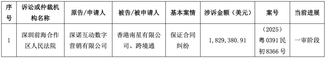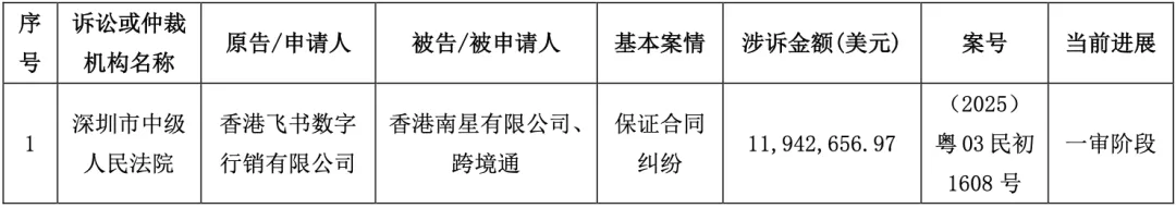 2025年6月,跨境通还披露了另一个诉讼,原告为香港飞书数字行销有限公司,和这个案件非常相似。