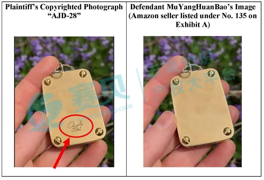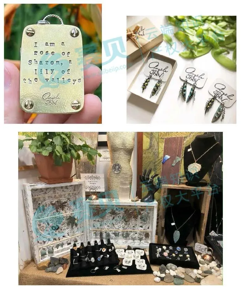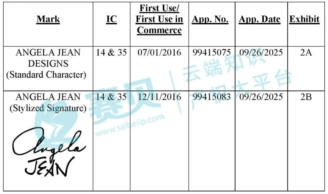 案件涉及的联邦注册版权的注册号为VA 2-445-736,是2025年5月16日注册的103张产品宣传照片,用于展示原告手工珠宝的外观、细节及使用场景。同时案件涉及2 个 “ANGELA JEAN” 系列商标,包含了标准字符版+手写签名版。赛贝提醒跨境卖家,未经授权不得擅自使用,以免引发侵权风险。