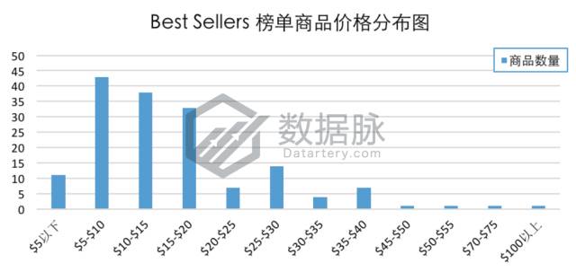 上周Clothing, Shoes & Jewelry品类Best Sellers榜单商品最高价$159.99,最低价$0.99,平均价格$16.87。骆探长(shujumai.com)发现,其中价格分布 在$5.00-$10.00区间内的上榜商品数量较多,占比达26.22%,其次有23.17%的商品定价在$10.00-$15.00区间,另有 20.12%的上榜商品位于$15.00-$20.00价格段。此外,标价$159.99的J.NINA珠宝项链在上周再次进榜,成为了唯一一款价格超过 了$100.00的上榜商品。