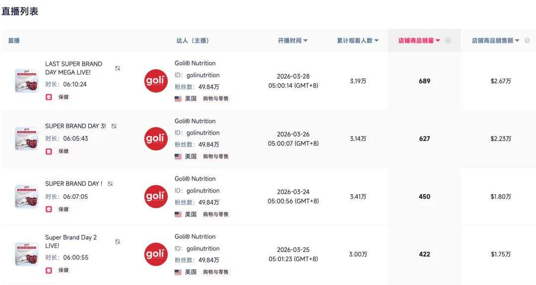 以保健品牌Goli为例,经过多年的精细化运营,其店播矩阵已覆盖全美主要消费群体,单场直播GMV稳定在1-3万美元之间。这种“达人带货引流+店播沉淀转化”的双轮驱动模式,让美国市场形成了“内容即成交”的高效商业闭环。