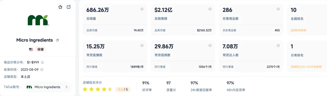 美区电商市场已形成以保健、美妆、收藏品为主导的品类结构,其中健康消费品类增长势头依旧强劲。MicroIngredients凭借其高品质的保健产品,在2026年3月继续蝉联美区保健小店销售额榜首,总销售额突破2亿美元。这一趋势与全球健康消费意识的提升密切相关,FastMoss的数据显示,美国消费者在健康产品上的支出同比增长了25%,且对天然、有机成分的产品需求日益增加。