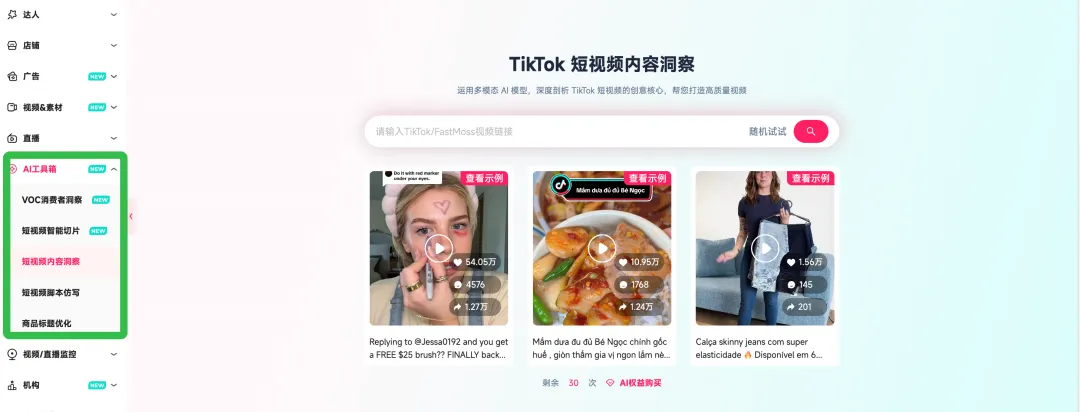 FastMoss的AI工具箱在2026年得到了进一步升级,为美国商家提供了更强大的内容生产支持。例如,智能脚本解析功能可以根据目标受众的喜好和消费习惯,自动生成个性化的直播脚本;爆款仿写功能则能快速分析竞品的成功案例,帮助商家优化自身的短视频内容。新兴美妆卖家对我们反馈「通过利用这些AI工具,将短视频发布频次提高了30%,单月GMV增长了150%」。