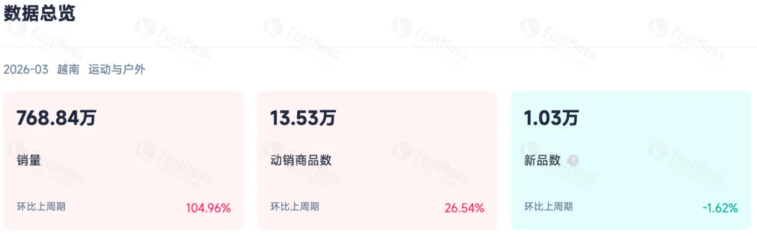 东南亚市场在2026年开年呈现出品类多元化的趋势。FastMoss爆品榜显示,越南市场运动与户外的销量同比增长了104.96%,马来西亚美妆个护品类产品的销量增长了13.85%。这种品类多元化的布局与东南亚消费者日益多样化的需求相契合。一位越南商家对我们反馈「通过FastMoss及时捕捉到消费者对环保家居用品的需求,迅速调整产品策略,将相关产品的上新周期缩短至5天,库存周转率提升了40%」。