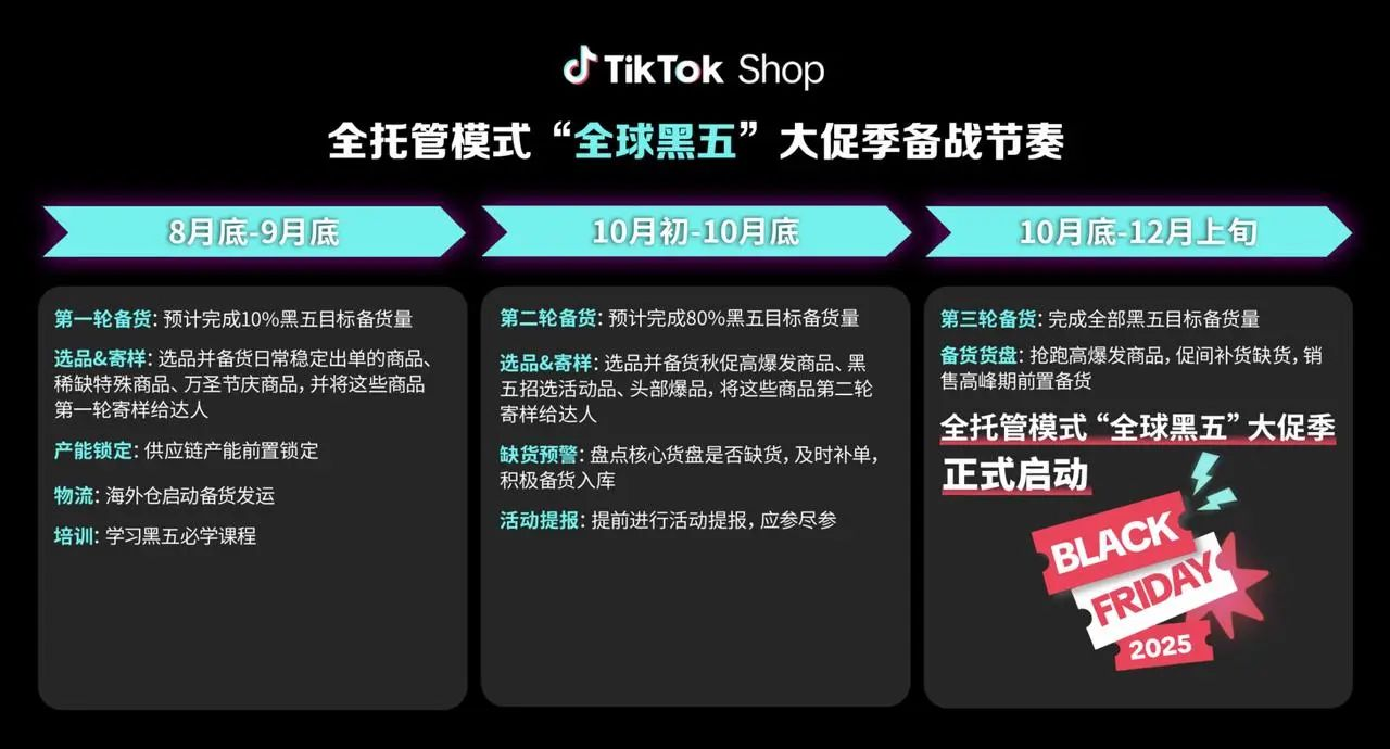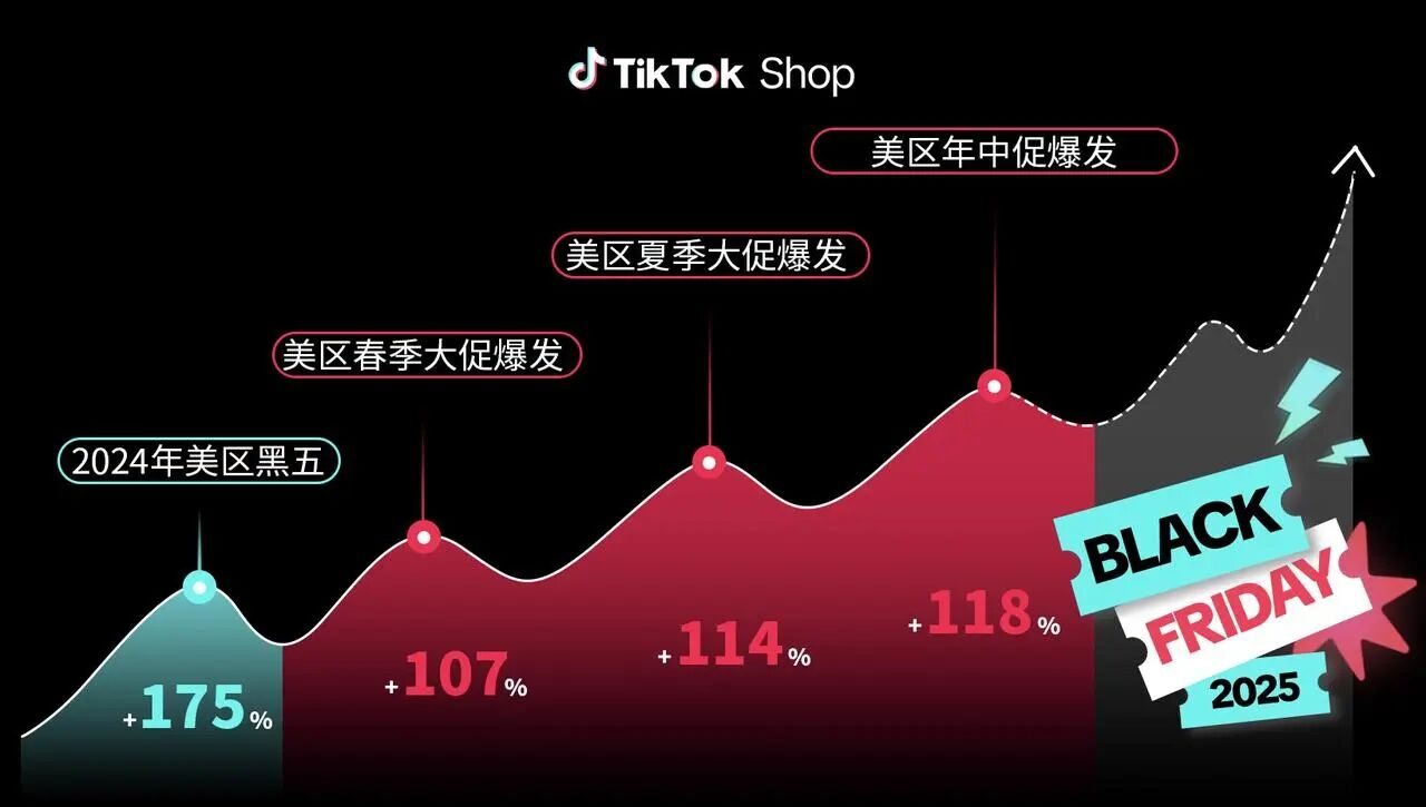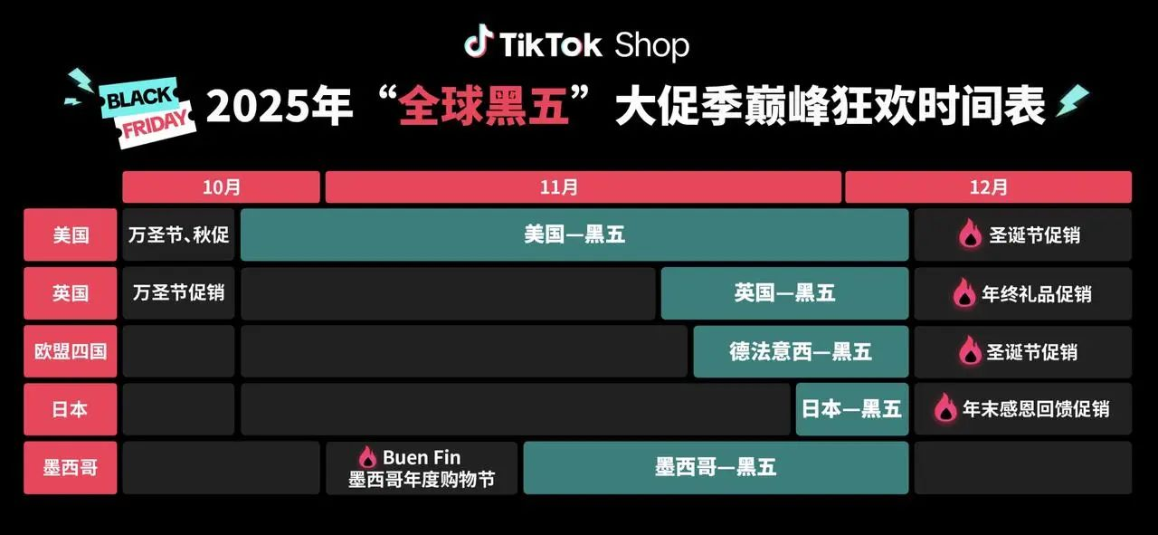 TikTok Shop 将重磅开启“全球黑五大促季”,横跨美国、英国、德国、法国、意大利、西班牙、日本、墨西哥八大核心市场,从10月下旬持续到12月初,覆盖黑五、网一等超级消费节点。