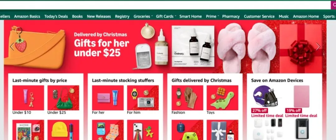 圣诞季来临,亚马逊已完成全站圣诞布局调整,将用户购物需求明确引导至“我要送礼”,前台的核心流量正在往“圣诞送礼”倾斜。