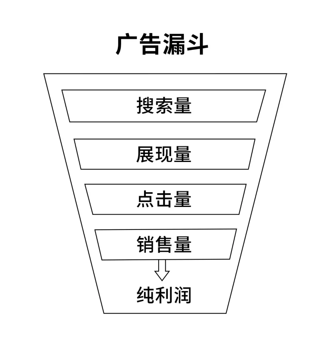 如上图,漏斗从上到下,每一层依次为搜索量,展现量,点击量,销售量,还有纯利润。卖家做广告的目的就是让流量尽可能多的流到漏斗底部。