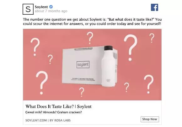 Soylent是一种营养饮料,而消费者最关心的问题是它的味道如何。于是Soylent推出了Facebook广告,利用这个问题成功地勾起受众的好奇心,推动购买欲。