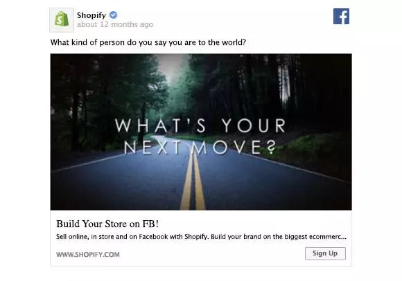Shopify的广告图片采用了激励型的社交媒体图片,去除了广告的气息,并直接针对Facebook个人用户滚动播放他们的广告,增加了其广告的转换率。