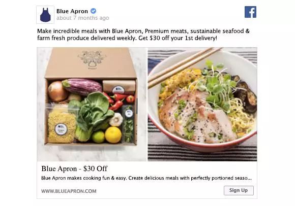 BlueApron意识到这一点,将重点放在他们的产品上,折扣显示在产品照片底部。当用户划过屏幕时,BlueApron广告舒服地呈现在用户眼前,吸引用户注意力。