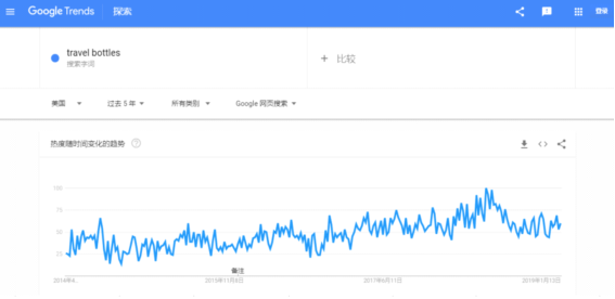 分装瓶产品在亚马逊美国站中,该类产品成本和市场定价偏低,不温不火,但市场需求较稳定,结合谷歌趋势近五年走势可以看出,呈现缓慢增长的趋势。在销售数据统计中,由于该类目下产品类型较多,关键词定义不准确,此处主要为旅行分装瓶类,因此该数值比实际偏低。
