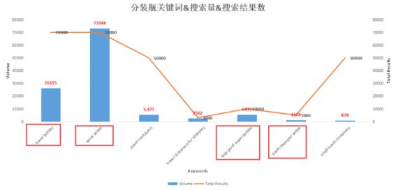 就旅行分装瓶而言,与所属类目关键词不一致,主词为travel bottles,Volume(搜索量)和Total Results(搜索结果数)比值低,竞争激烈;但在该类目下的产品中,喷雾瓶(含喷洒瓶)市场需求也不小,且与其他滴管瓶、香水喷雾瓶等产品不仅外出实用,市场生活中也是常用物品,因此该类目下主词确定不明显。