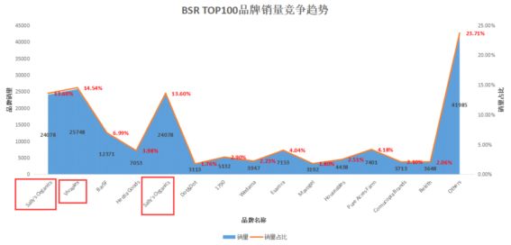 BSR TOP100中,一共约有63个品牌。其中销量占比稍高的主要为Sally's Organics、Vivaplex、Sally's Organics三个品牌,分别为13.60%、14.54%、13.60%,三个品牌在TOP 100中销量约占42%,具有一定的竞争优势。但与该类产品特性有关,主要区分在于功能及外观,也难以做到品牌化,因此垄断现象不严重,品牌竞争性也不强。