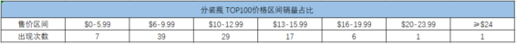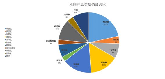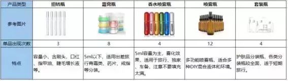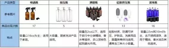 各种产品类型参考图片及特点如上表所示。从单品出现次数角度来看,喷洒瓶、滚珠瓶、硅胶挤压瓶和喷雾瓶出现次数较高,分别为17次、16次、13次和12次,这几类产品出现频数较高,结合销量占比图来看,同样这几种产品占比较高,分别为22%、16%、15%和11%。