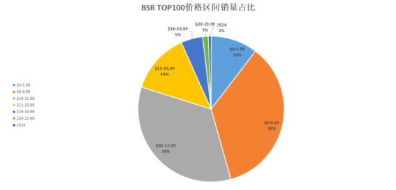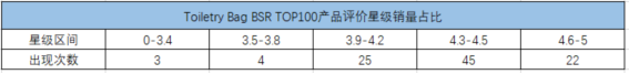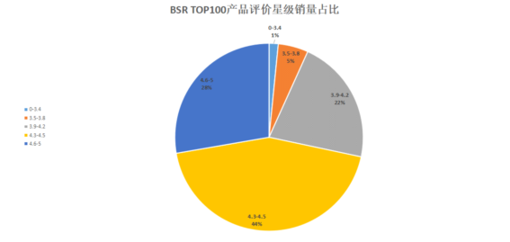 BSR TOP100中,3.9星及以上产品单品出现92次,3.9-4.2、4.3-4.5、4.6-5销量占比分别为22%、44%、28%。对于这类实用性强的产品来说,一般情况下没有严重质量问题或服务问题,所引来的差评是较少的;亚马逊上很大比例的买家都会通过评价来判断一款产品是否适合自己,若差评比例太高,对销量影响是相当大的。